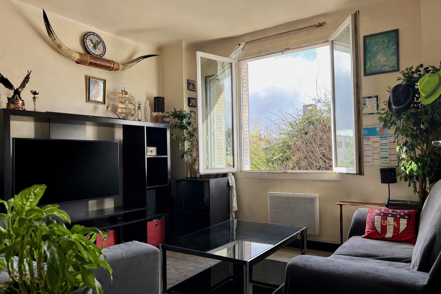 L’appartement, qui bénéficie d’une belle luminosité grâce à son exposition Sud/Ouest, se compose d’un hall d’entrée desservant une cuisine équipée ouverte sur le séjour, créant un espace de vie convivial et lumineux.